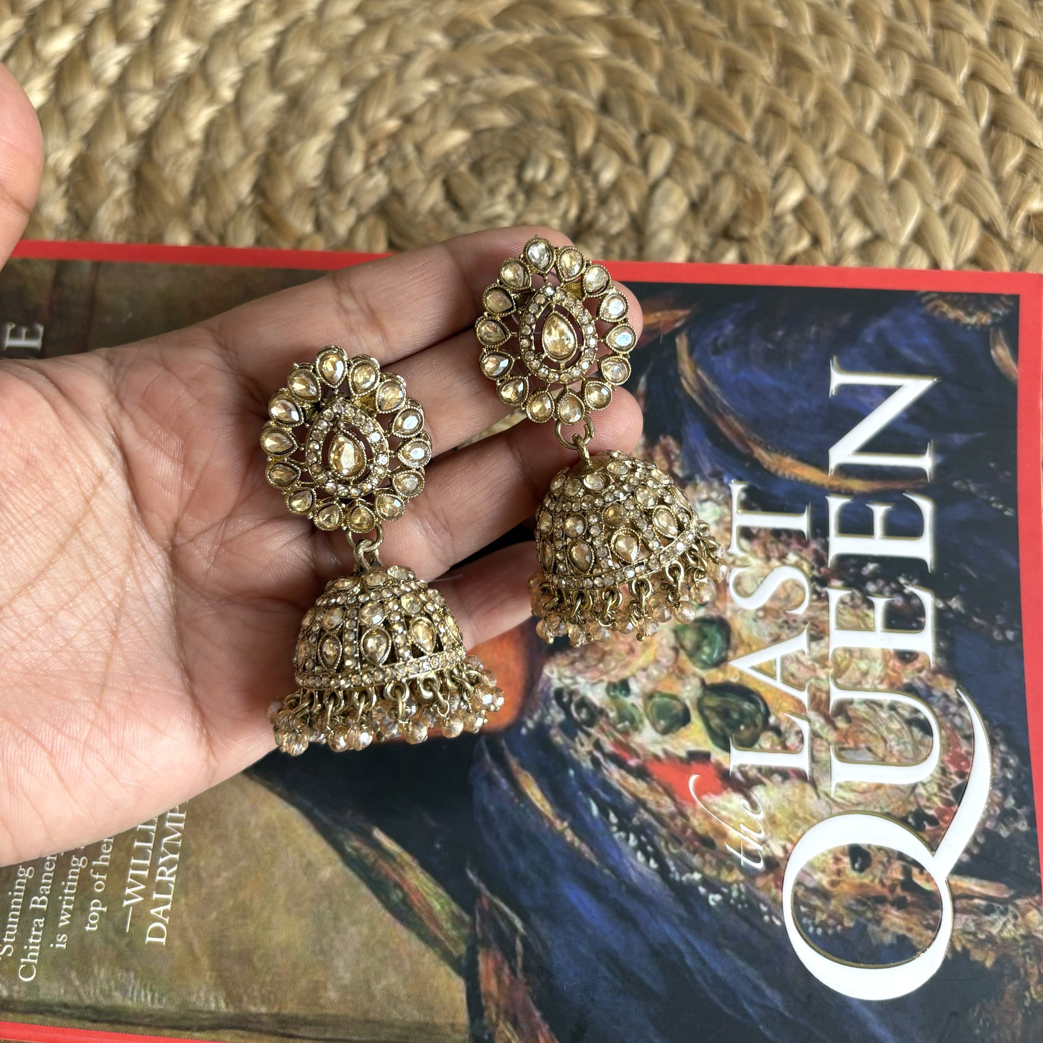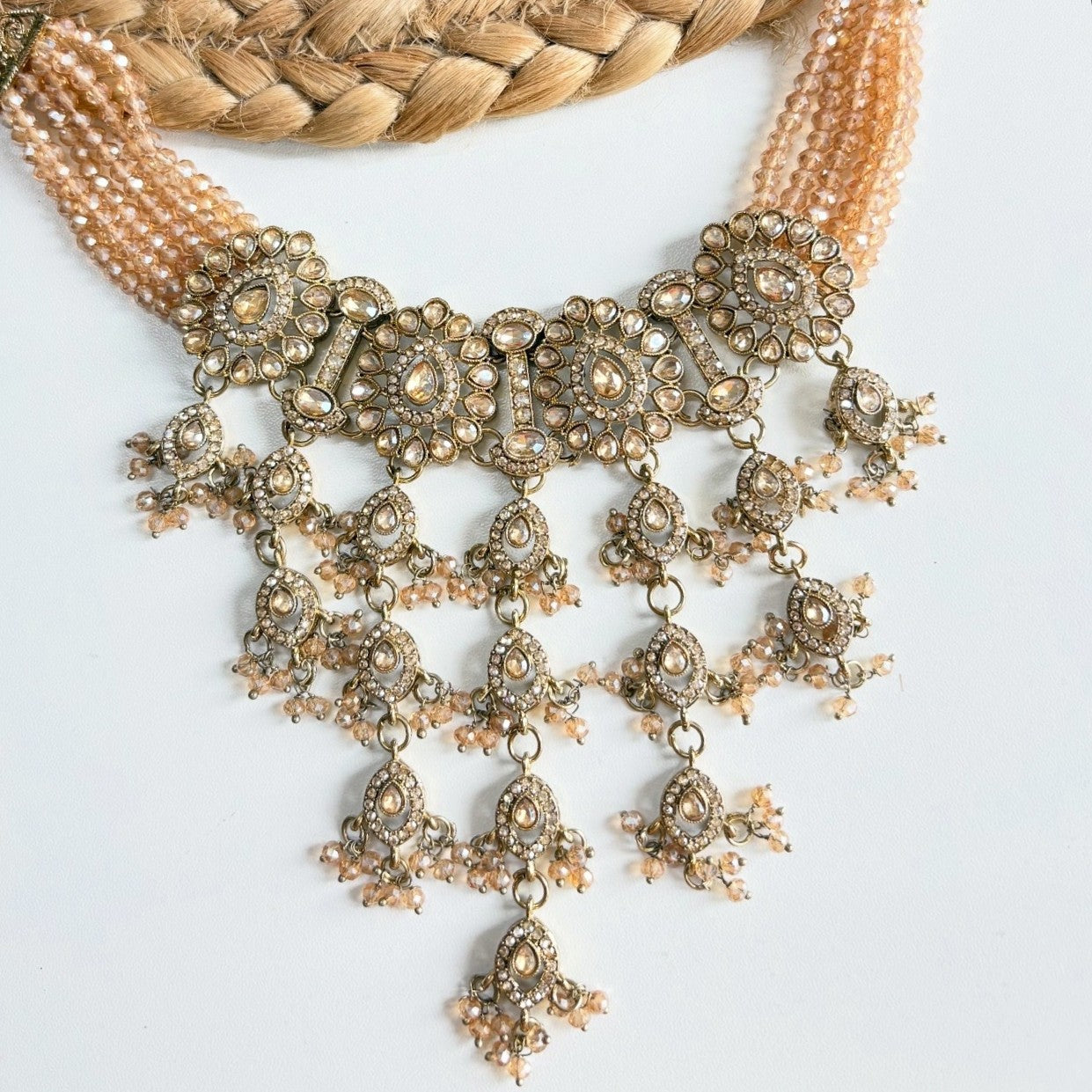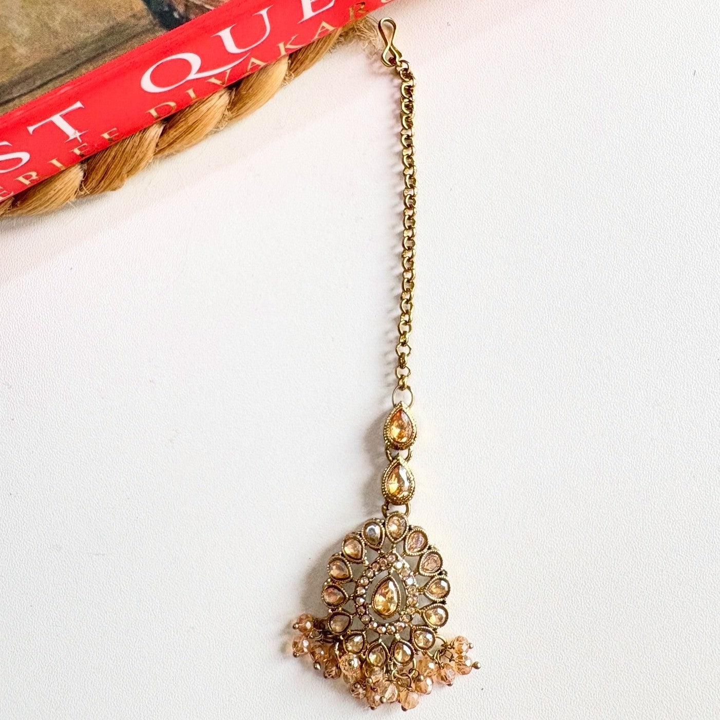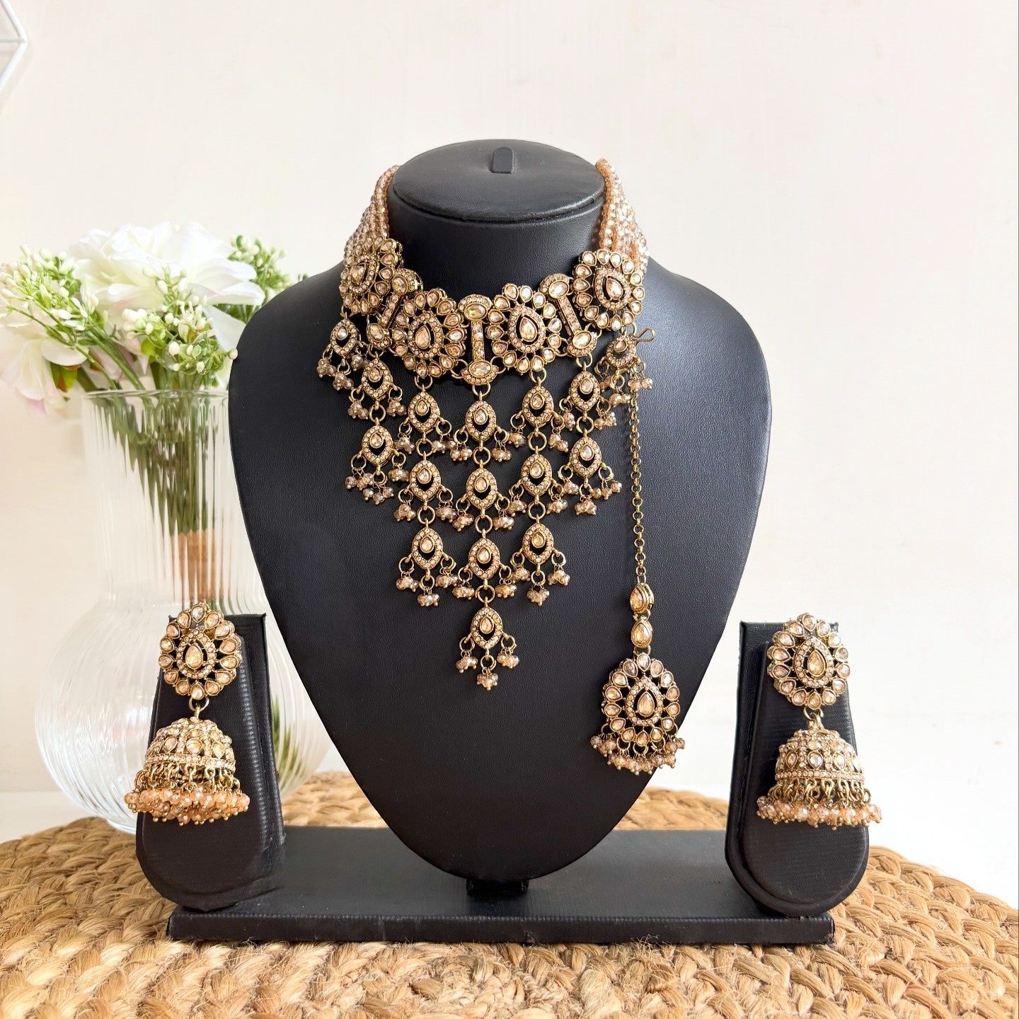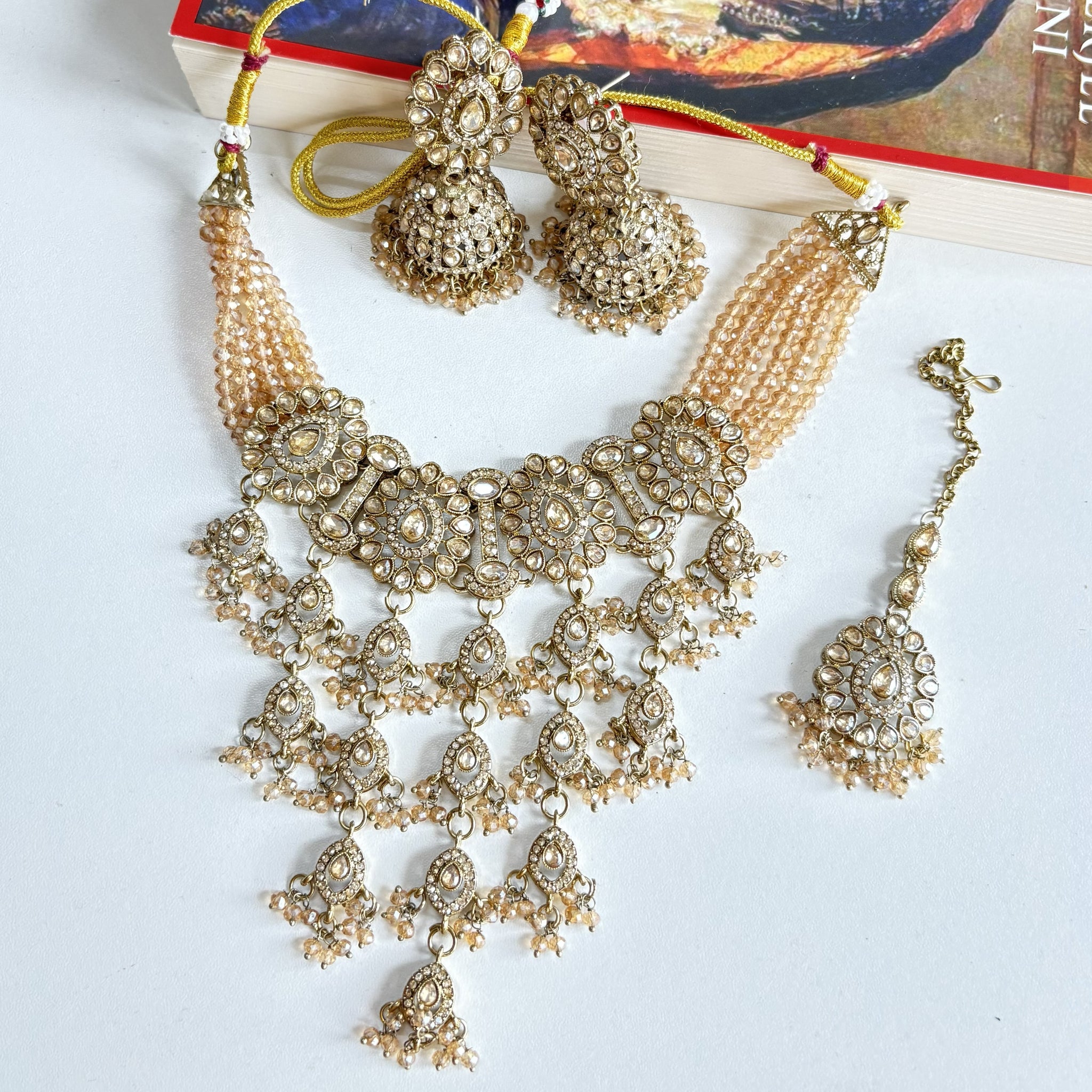 An exquisite statement jewellery set crafted with intricate detailing, perfect for brides and festive occasions. Comes with matching jhumkas and mang tikka for a complete royal look.